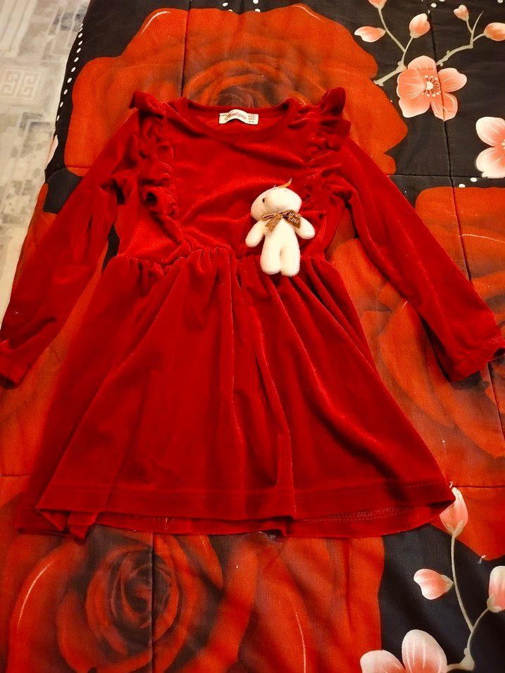 Kız çocuk için kırmızı, , uzun kollu, fırfır detaylı ve bol kesim yumuşak ve sıcak bir kumaştan yapılmış elbise.