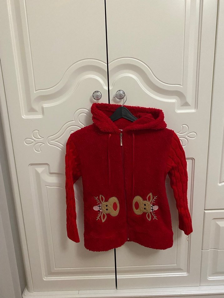 Kapüşonlu, örgü dokulu ve yumuşak kız çocuk ceketi. Kırmızı renkte, renkli işlemeli geyik desenleriyle sokak stiline uygun.