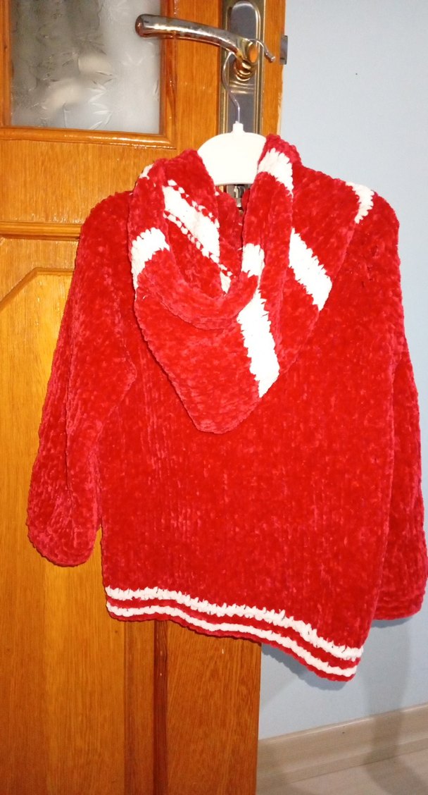 Renkli kırmızı örgü hırka, uzun kollu ve bol kesim. Yumuşak ve sıcak kumaştan, düğmeli kapüşonlu tasarım.