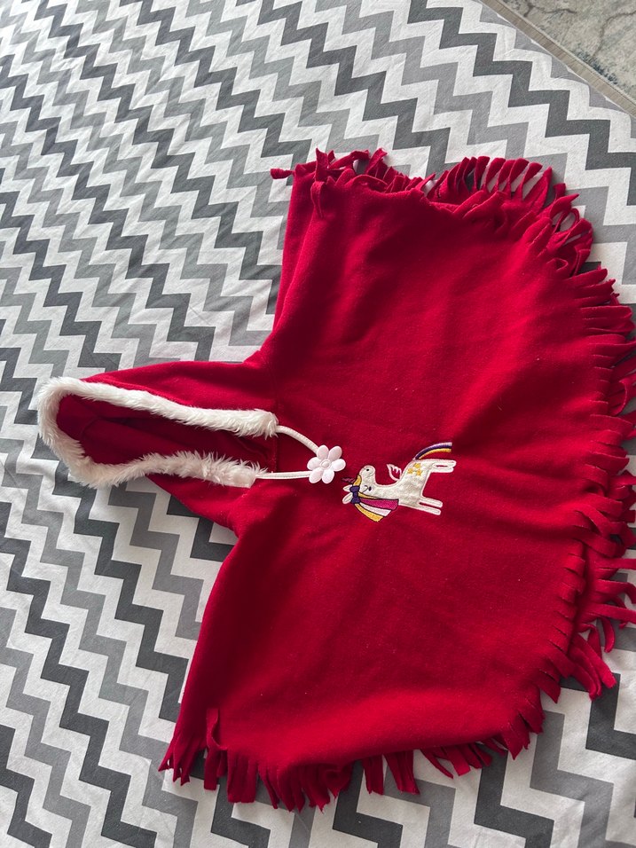 Kız çocukları için kapüşonlu kırmızı ponço, çiçek detaylıdır. Yumuşak kürk detay ve püsküllü kenarlarıyla işlenmiştir. Etiket 5-6 yaş diyor ama sadece omuzu kapatmasın diyorsanız 1 yaşta kullanmalısınız. 5-6 yaşın sadece omuzu kapatır. 1-2 yaş kol ve göbek örter. Hiç sorunu yok.