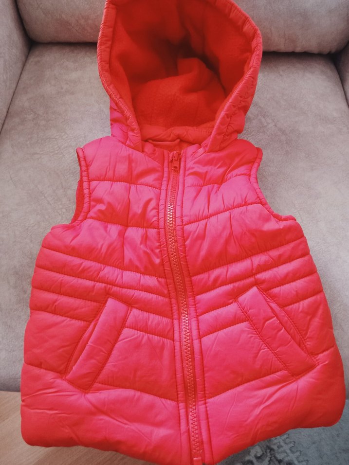 Kız çocuk için kapüşonlu, fermuarlı, kolu olmayan, fitted kesim kırmızı yelek. Yumuşak ve sıcak kumaştan, sokak modasına uygun.