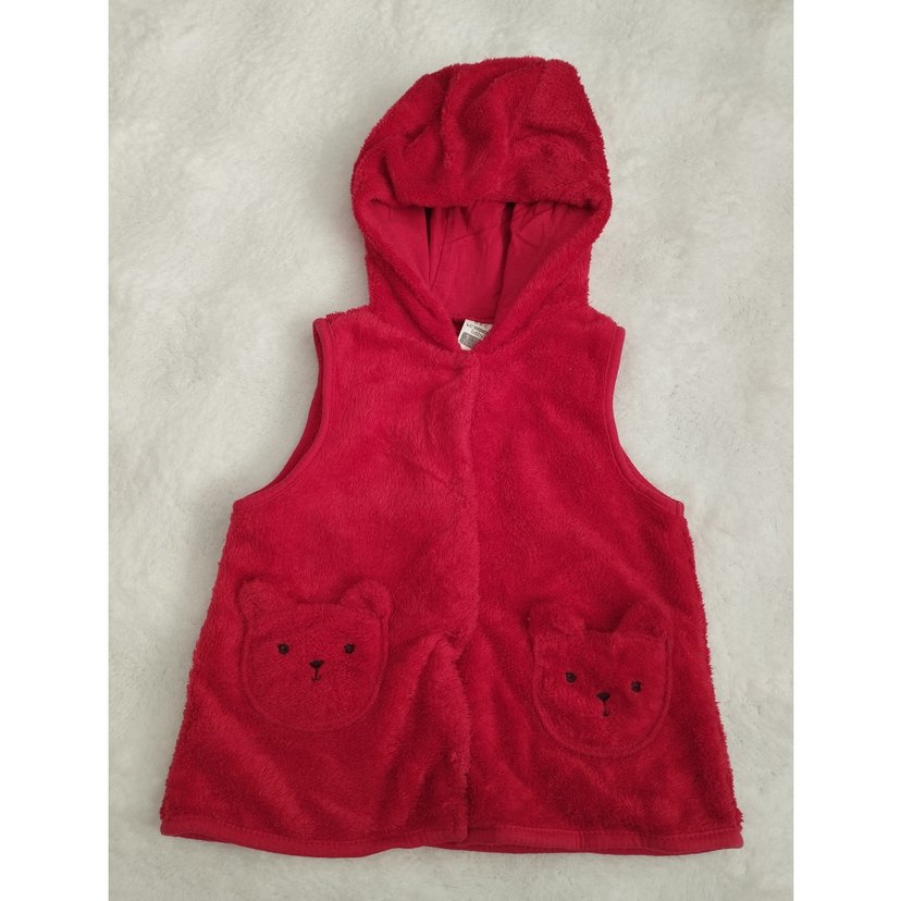 Kız çocukları için kapüşonlu, yumuşak ve sıcak kumaştan yapılmış, sıfır kollu, dar kesim yelek. Renkli nakışlı ayıcık cepleriyle sokak stiline uygun.