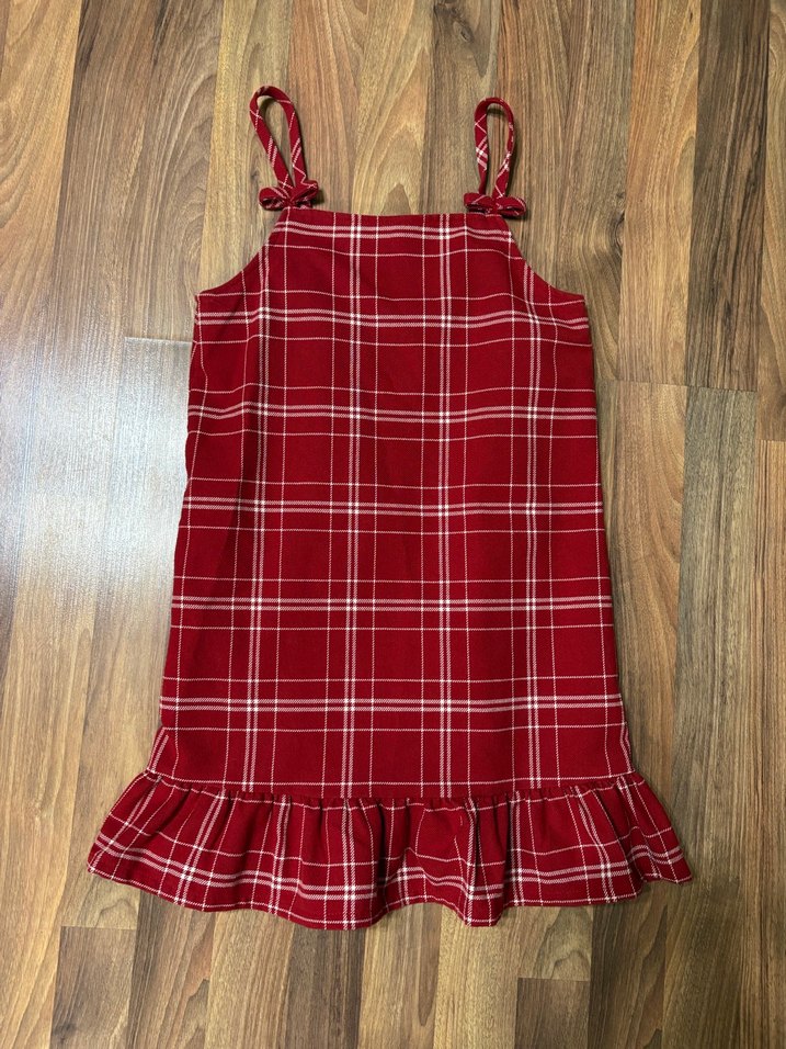 Kız çocukları için kırmızı kareli, askılı ve volan detaylı rahat kesim elbise. Sentetik kumaştan üretilmiştir.