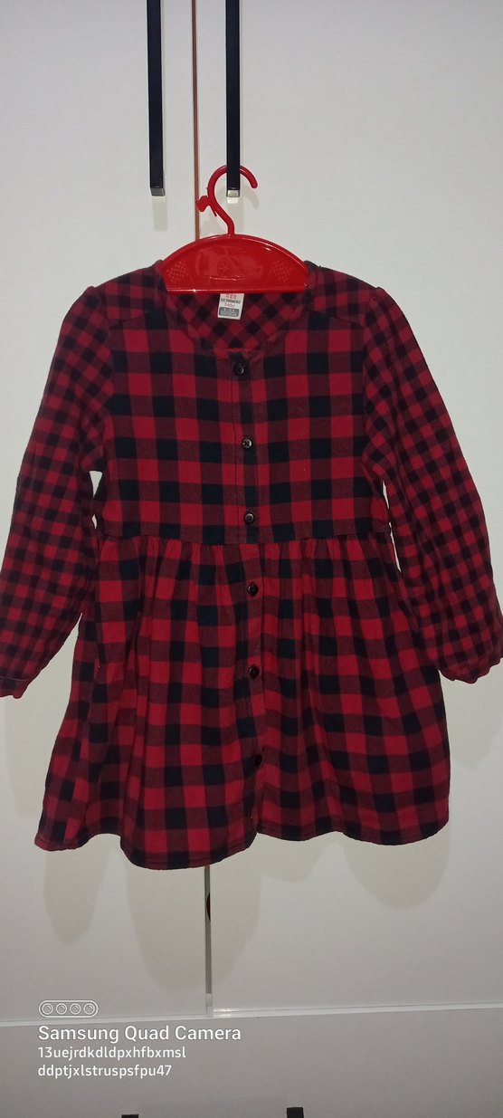 Uzun kollu, düğmeli ve bol kesim kız çocuk elbisesi. Koyu kırmızı kareli desene ve yuvarlak yakaya sahip, yumuşak ve sıcak kumaştan yapılmıştır.