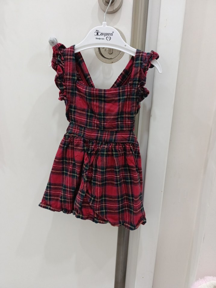 Kolsuz, fırfırlı omuz detaylı, halter yaka kız çocuk elbisesi. Rahat kesim ve renkli kırmızı kareli desene sahip, sentetik kumaştan üretilmiştir. Cayzen askıya asılmıştır.