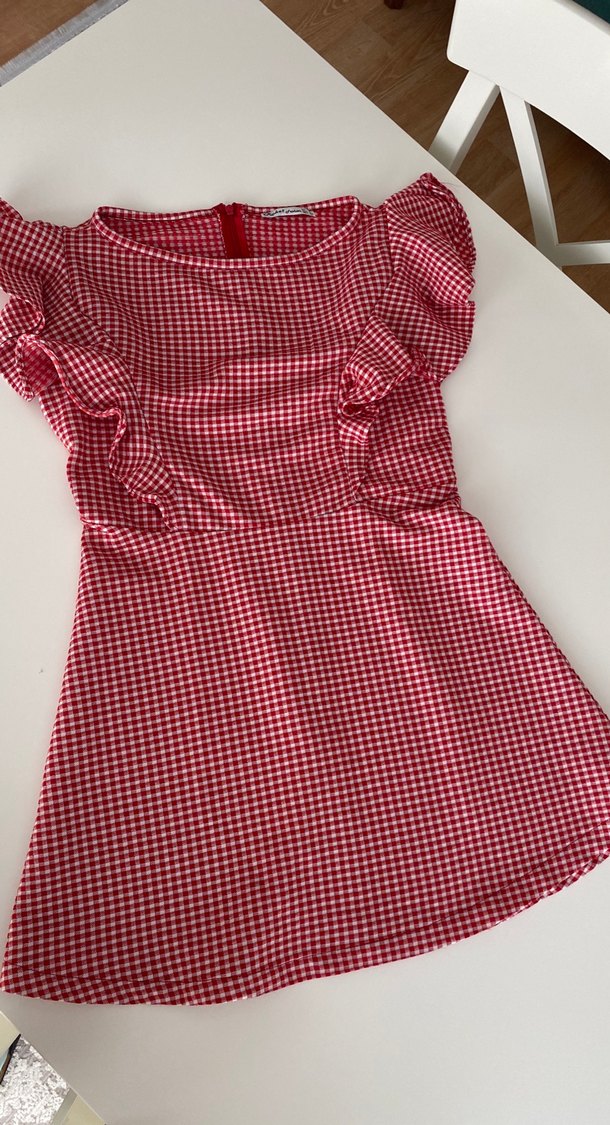 Kız çocuklar için, kısa kollu, tek renkli kırmızı kareli, fırfırlı, tek parça elbisedir. Sentetik kumaştan üretilmiş, salaş oturan bir modeldir. Uzunluk 70cm