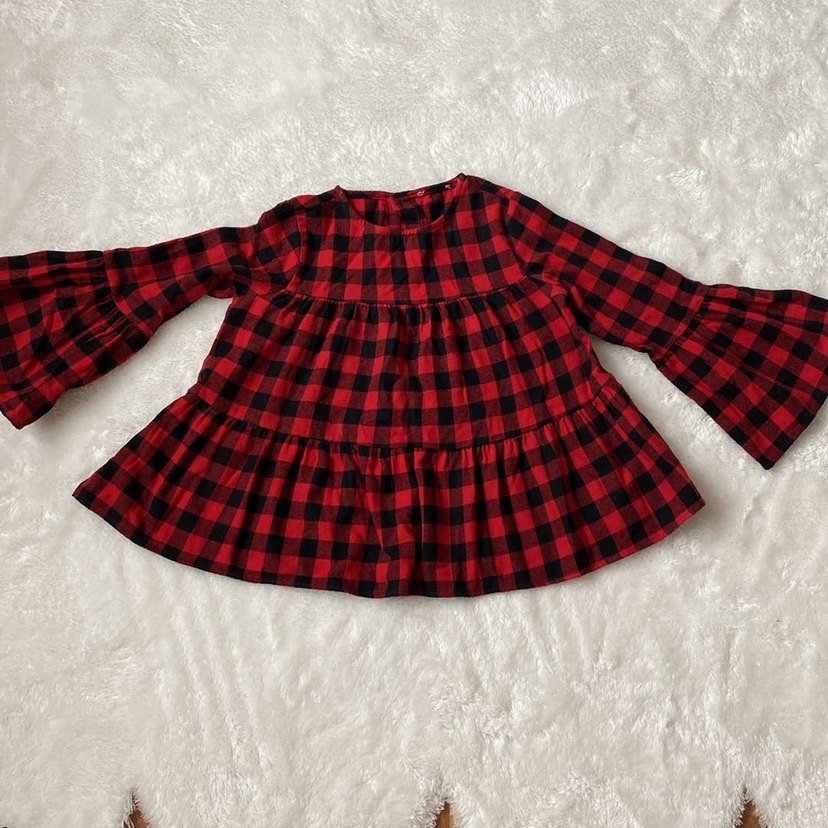 Uzun kollu, yuvarlak yaka, bol kesim kız çocuk gömleği, renkli kırmızı kareli ve fırfır detaylı. Yumuşak ve sıcak kumaştan.