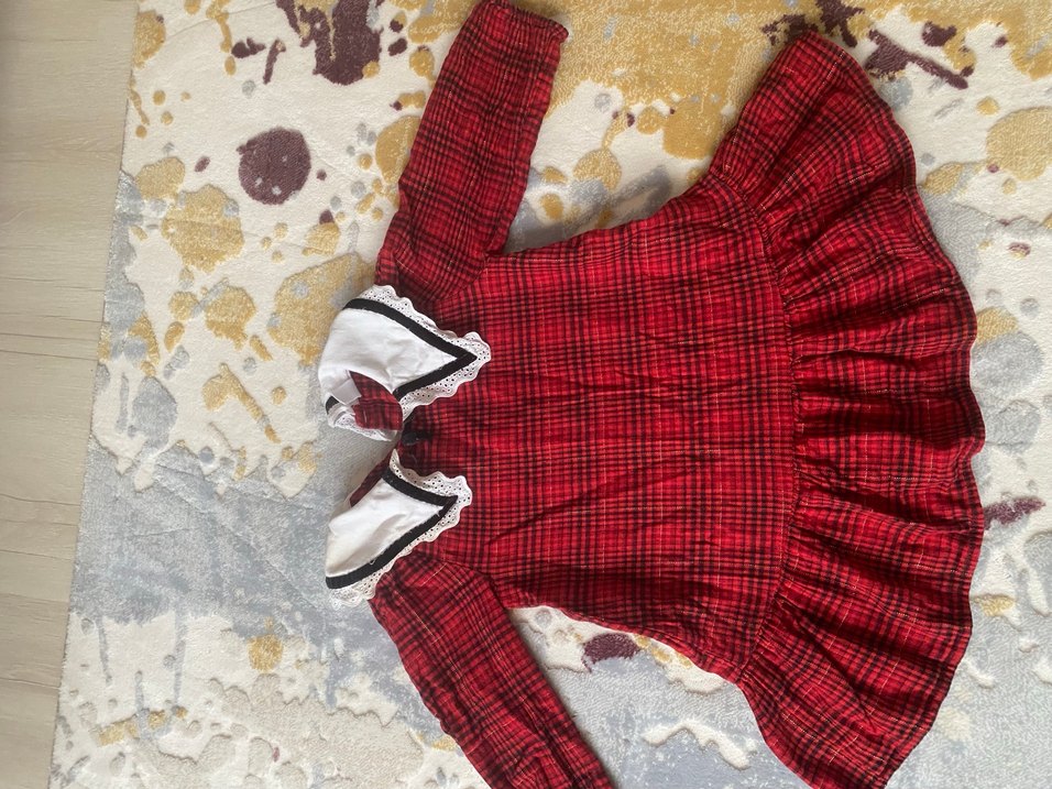 (Yakasında bir leke var beyaz yerde cıkar)))Koyu kırmızı kareli, uzun kollu, yakalı ve fırfırlı detaylı kız çocuk elbisesi. Sentetik kumaştan, dar kesim ve sokak tarzında.