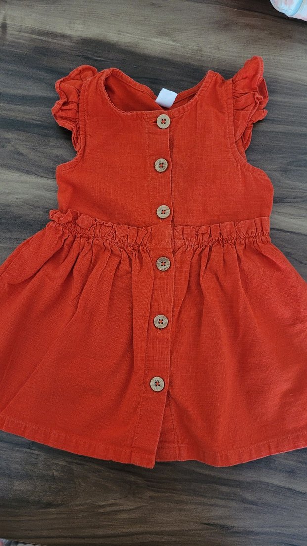 Kız çocukları için kırmızı keten, düğmeli, kolsuz, bol kesim elbise. Yuvarlak yakalı ve hafif fırfırlı kollara sahip. Severek kullandık