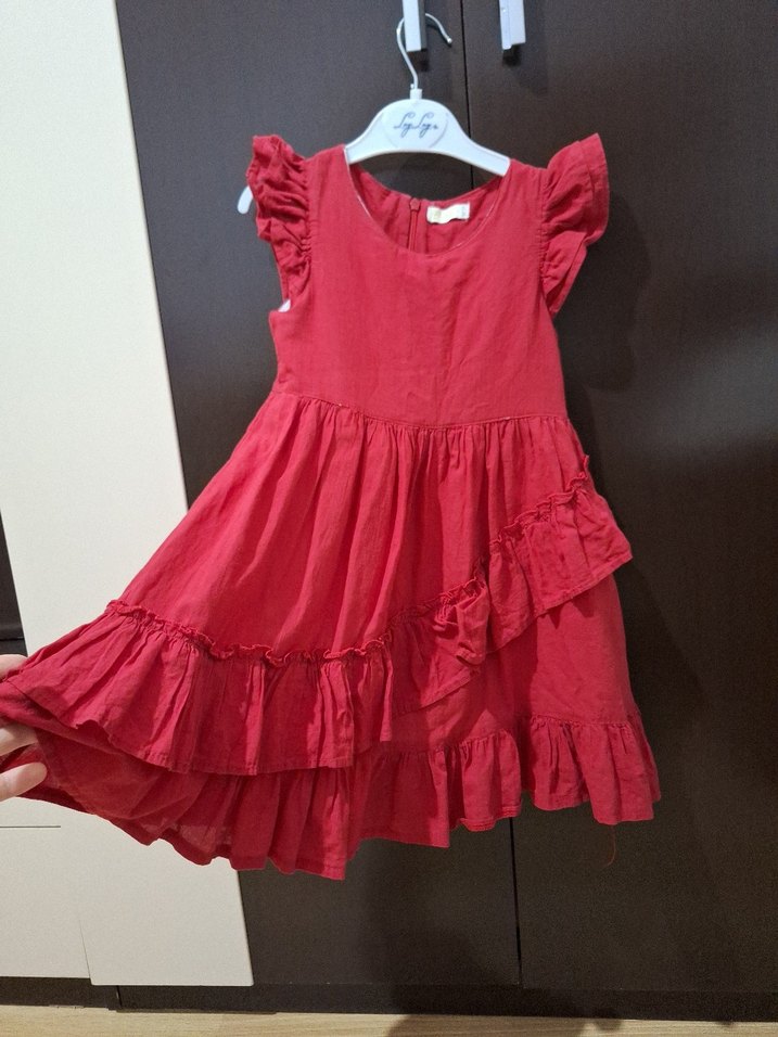Kız Çocuk Kırmızı Keten Fırfırlı Elbise