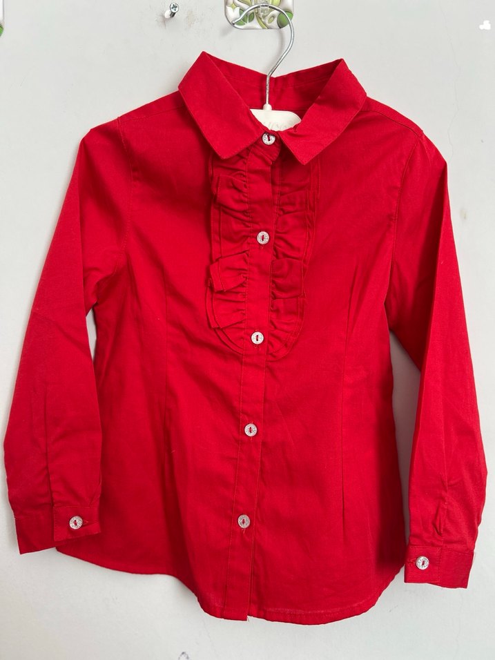 Keten kumaştan, uzun kollu, yakalı ve önünde fırfır detaylı kırmızı renkli kız çocuk gömleği. Sokak stiline uygun sade ve renkli tasarım.