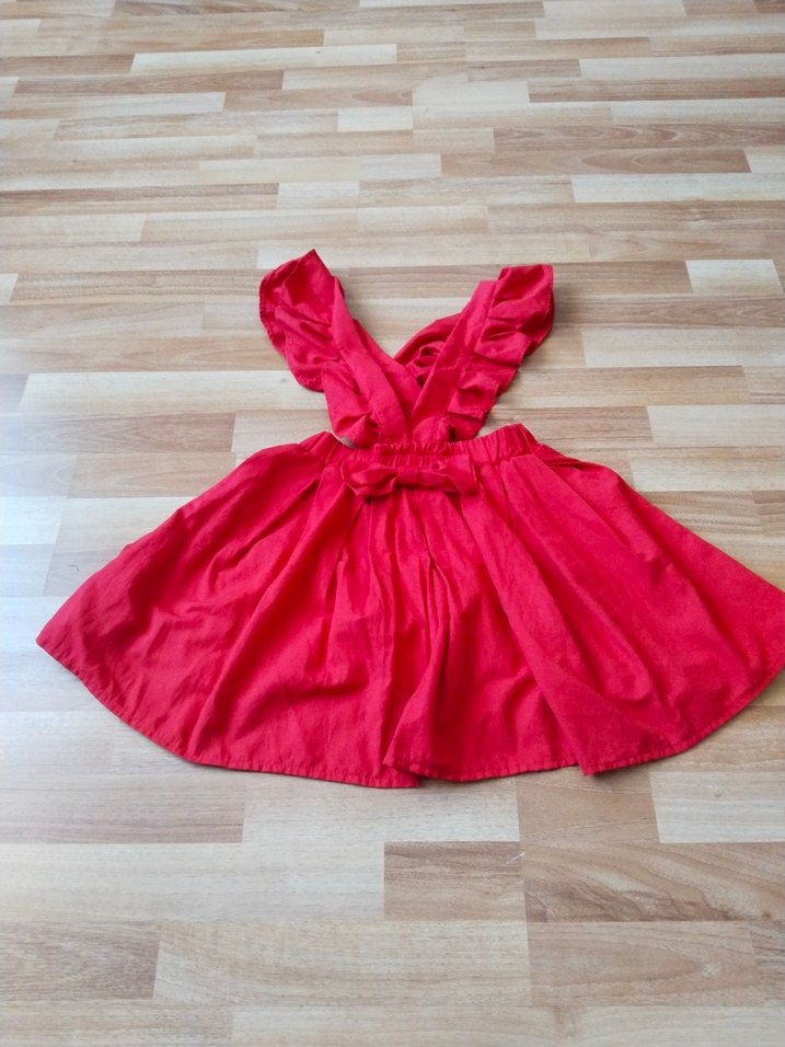 Kız çocukları için kırmızı keten elbise, bol kesim, askılı ve V yakalıdır. Volan detaylarıyla bohem tarz sunar. 6-10 yaşa kadar uyar.