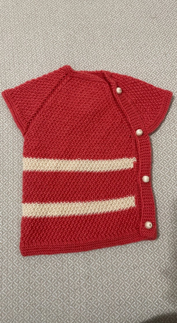 Kısa kollu, kırmızı renkli kız çocuk örgü hırka, yan tarafta inci düğmeler ve iki krem renkli yatay çizgi ile sade tasarıma sahiptir. 6ay-1yaş