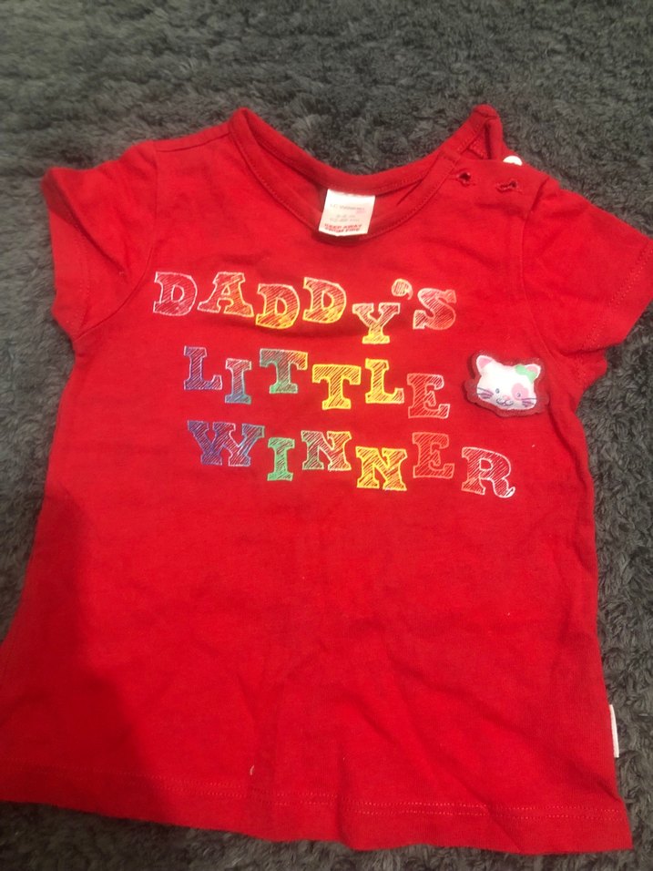 Kız çocukları için kısa kollu, bisiklet yaka ve dar kesim kırmızı tişört. Renkli baskılı yazılar ve sim detayları bulunur. "Daddy's Little Winner" yazılıdır. Yeni giyilmedi