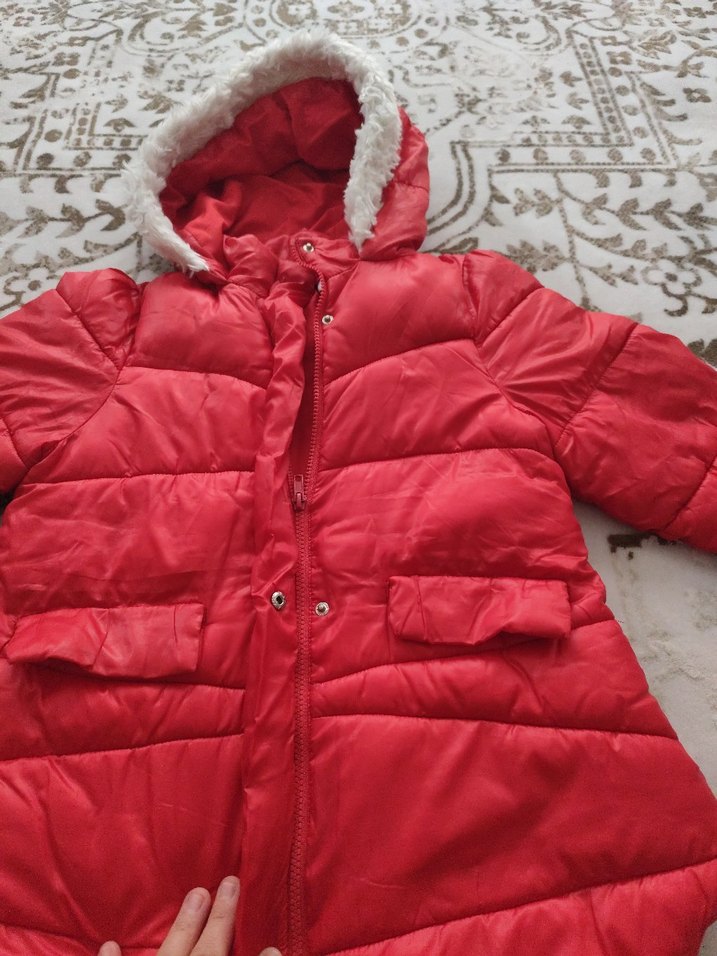 Parlak kırmızı renkli, kız çocukları için uzun kollu, kürklü kapüşonlu ve notlu yaka detaylı, orta boy uzunlukta sıcak ve rahat kumaştan üretilmiş kaban. ❄️