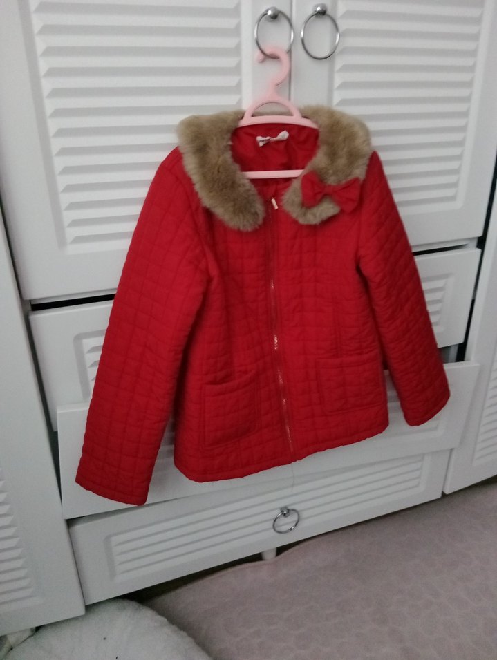 Kız çocukları için kırmızı, yumuşak ve sıcak kumaştan, yakasında kürk ve dekoratif fiyonk detaylı, dar kesim mont.
