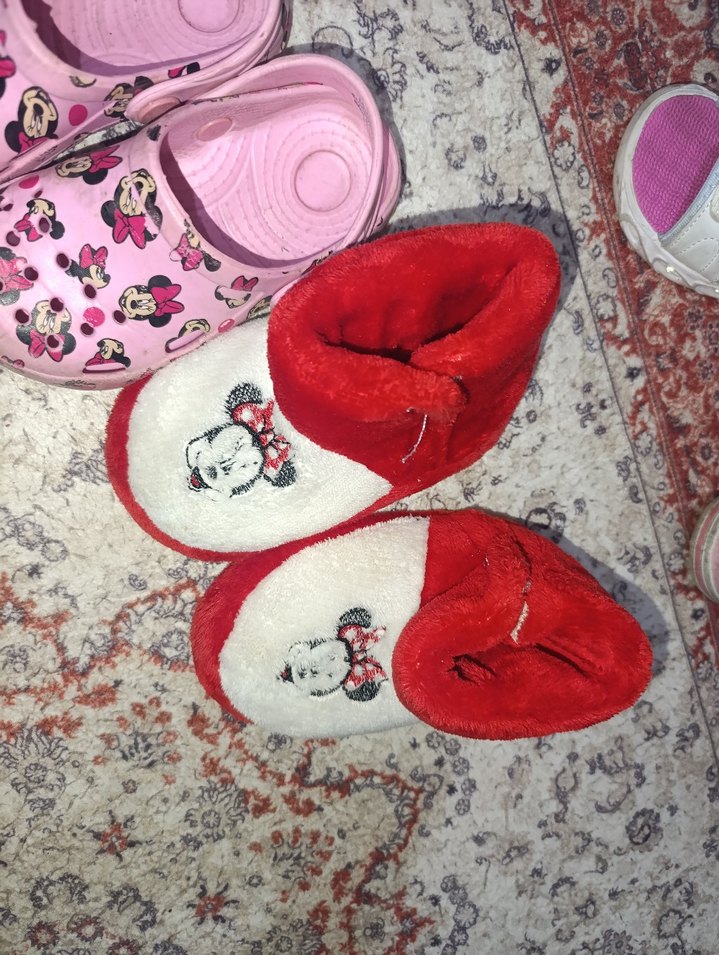 Kız çocukları için kırmızı ve beyaz kürklü, renkli nakış detaylı sıcak ve yumuşak ev terlikleri.