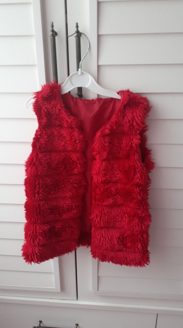 Kırmızı, kürklü detaylı, kolsuz, V yaka, fitted kesim yelek. Sıcak tutan yumuşak kumaştan, streetwear tarzında.