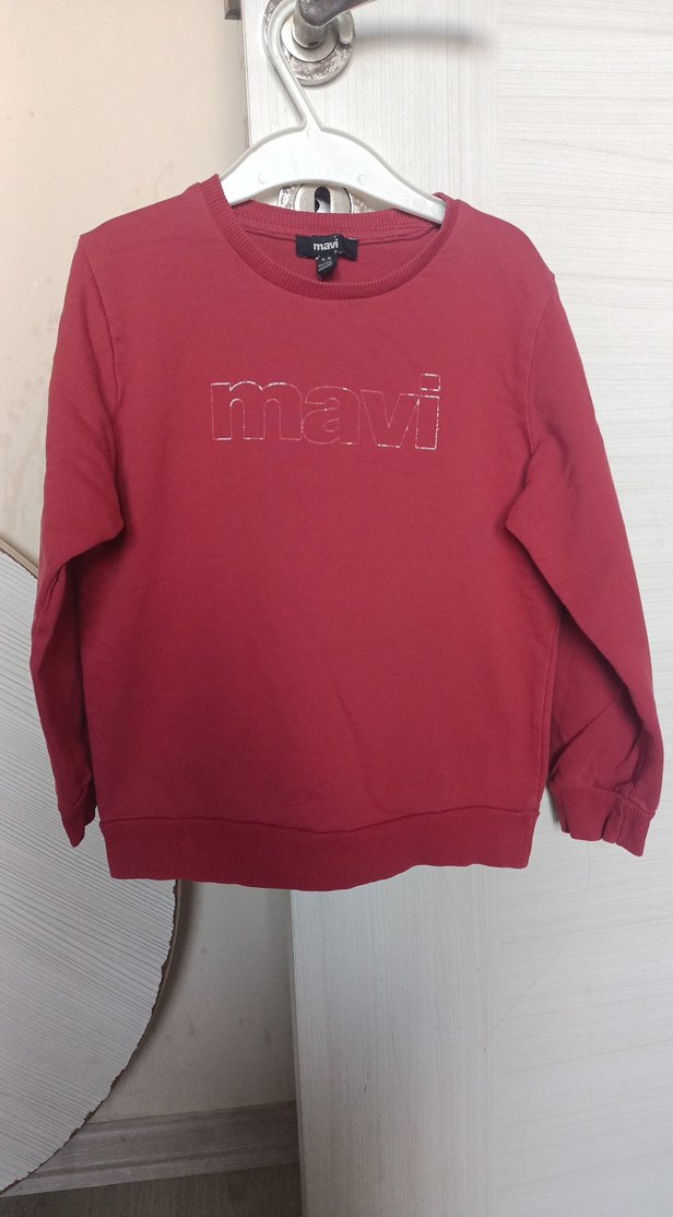 Kız çocukları için kırmızı, yuvarlak yaka, uzun kollu, bol kesim sweatshirt. Yumuşak örme kumaştan, önünde "mavi" baskılı logo bulunur.