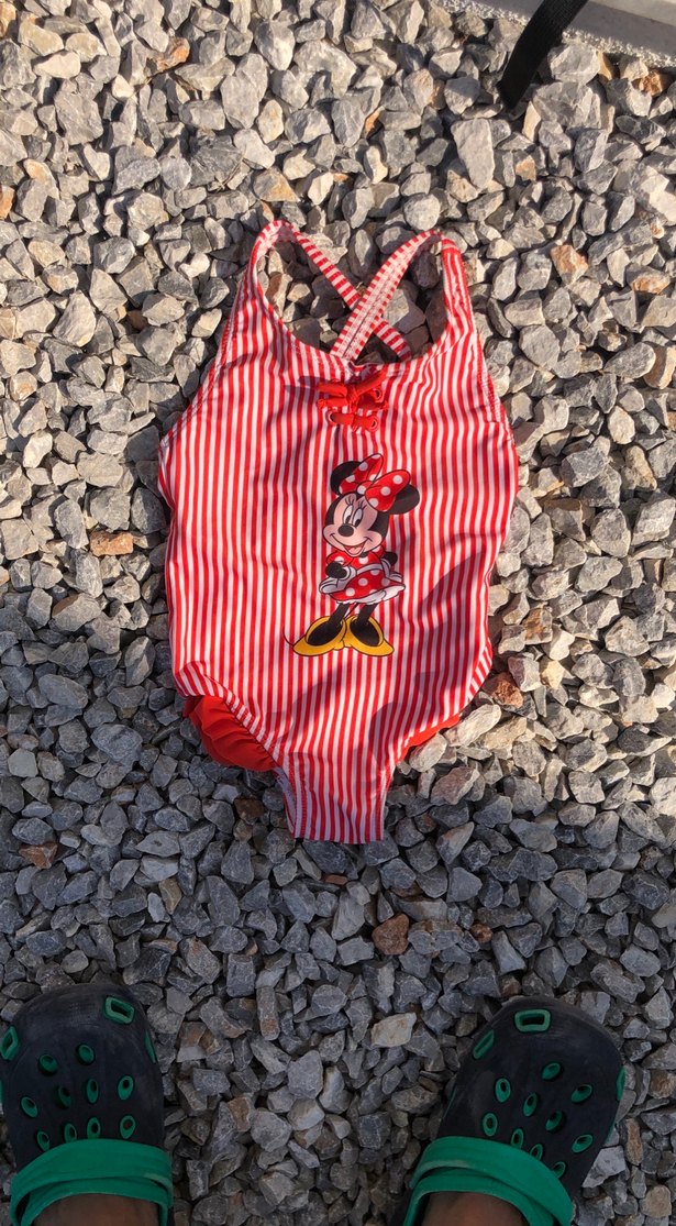 Renkli kırmızı mayo, askılı ve vücuda oturan kesime sahip. Fırfırlı detayları ve işlemeli Minnie Mouse deseni ile plaj için uygundur.