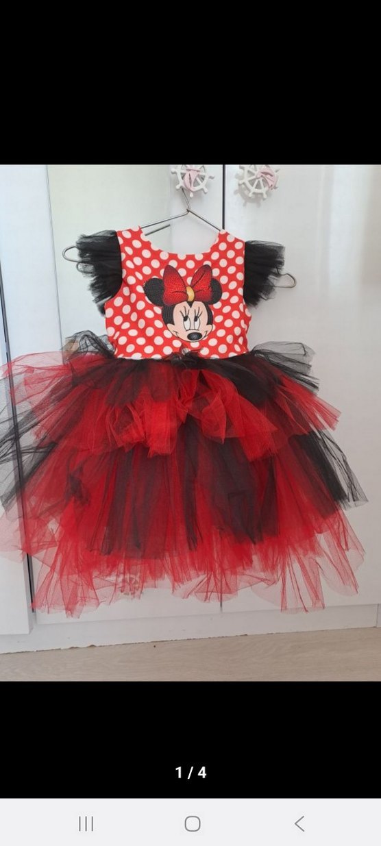 Kırmızı beyaz puantiyeli Minnie Mouse baskılı, siyah fırfırlı kollu, renkli kat kat tül etekli kız çocuk elbisesi.