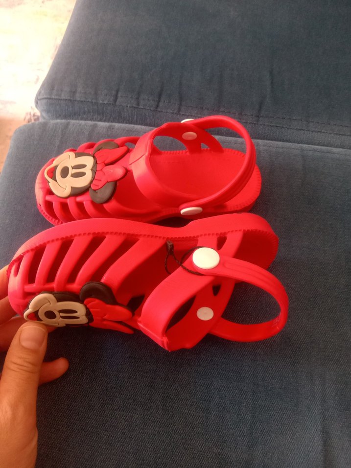 Kız çocuklar için kırmızı kauçuk terlik, tokalı bant ve renkli Minnie Mouse baskısıyla rahat ve eğlenceli.sifirdir