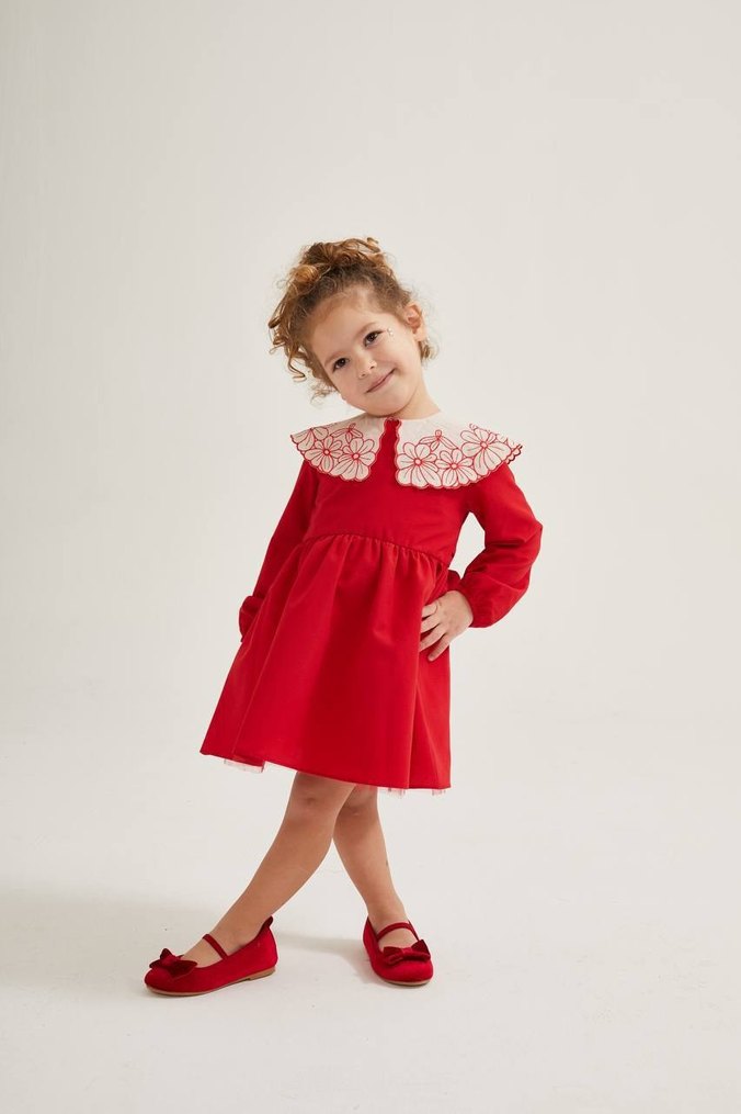 Kız Çocuk Kırmızı Nakışlı Fırfırlı Elbise
