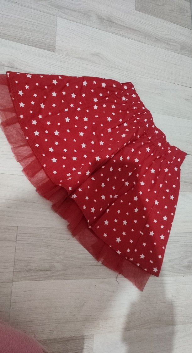 Kırmızı nakışlı yıldız desenli, fırfırlı ve sentetik kumaştan yapılmış, bol kesim kız çocuk eteği.