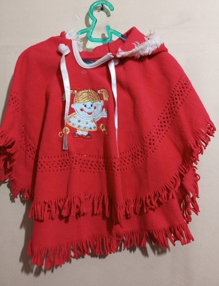 Kırmızı renkli, kapüşonlu ve uzun kollu kız çocuk pançosu. Nakışlı desenler, örgü detaylar ve püsküllü kenarlarla bohem tarzı sunar. 4-5-6-7 yaşlara uygun.