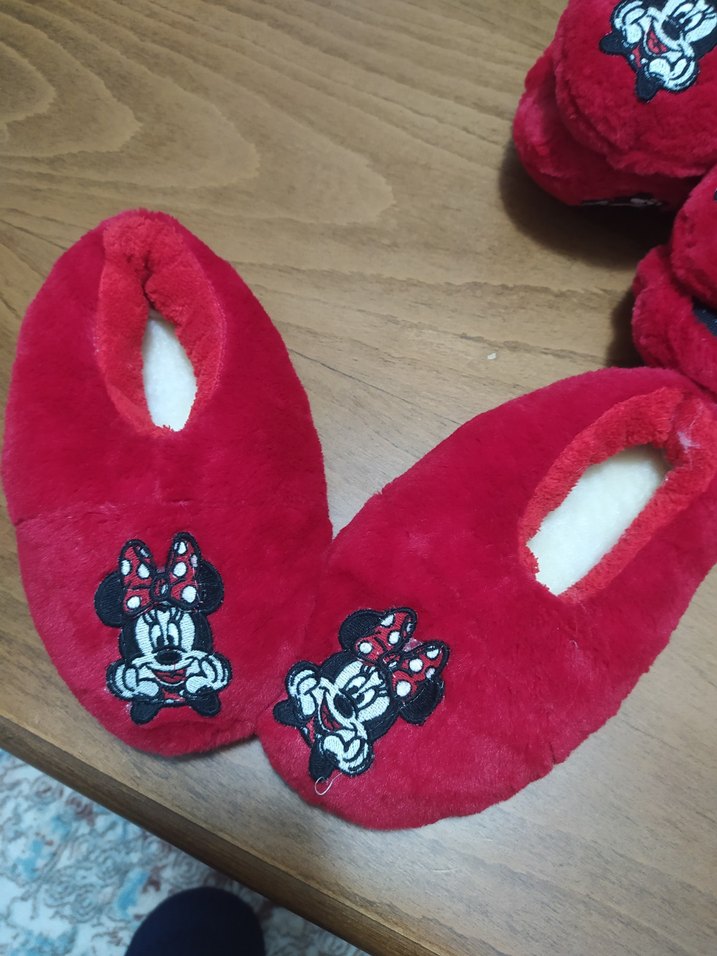 Kız çocukları için kırmızı, nakışlı Minnie Mouse desenli, içi kürklü sıcak ev terliği. Rahat ve yumuşak iç yüzeye sahiptir.