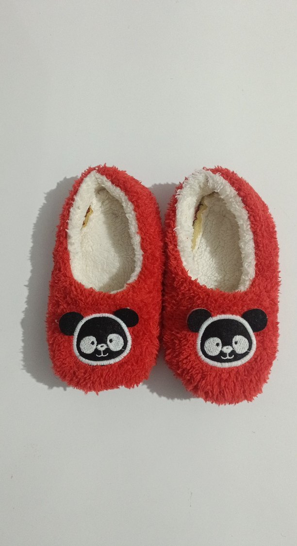 Kız çocukları için kırmızı renkli, nakışlı panda desenli, yumuşak ve sıcak dokulu örgü ev terlikleri.
