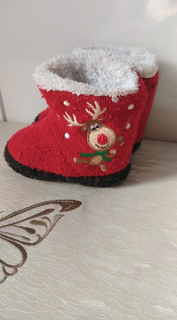 Kız çocuklar için örme, kırmızı nakışlı geyik desenli, yumuşak ve sıcak tüylü astarlı ev terliği. Geleneksel tarzda rahat kullanım sağlar.