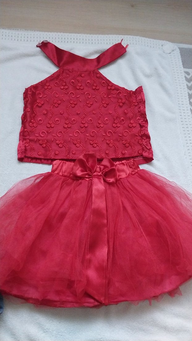 Nakışlı kırmızı sentetik kumaştan, straplez ve dantelli, vücuda oturan üst kısmı olan kız çocuk elbisesi. Kolsuz ve tül etekli, renkli bohem tarzda şık bir tasarım. birlikte de alabilirsiniz ayrı ayrı da yeni gibi