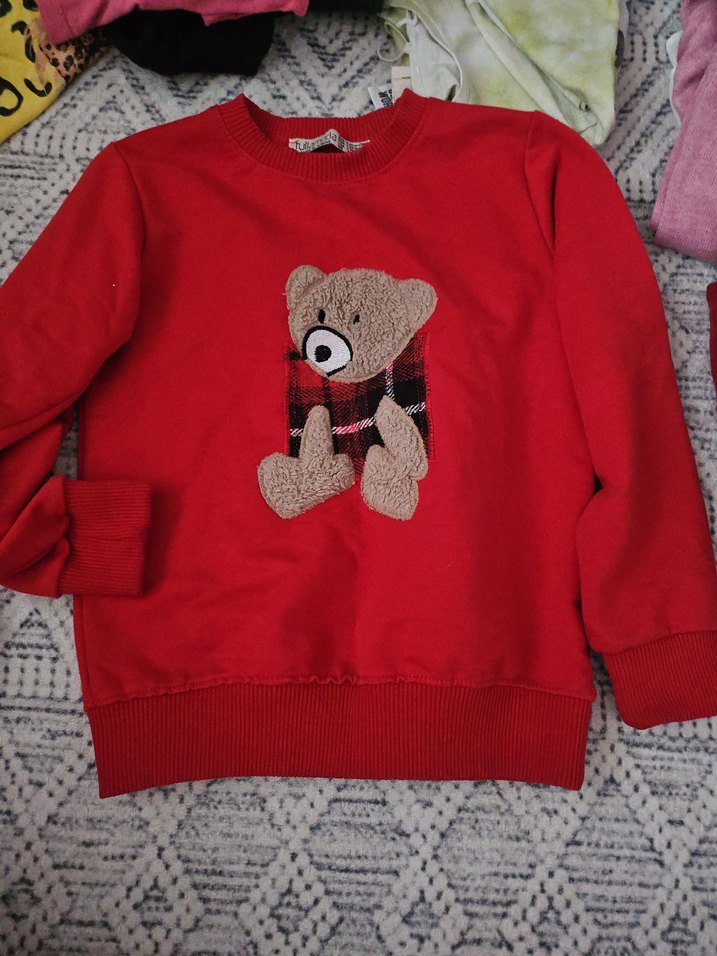 Kız çocukları için uzun kollu, yuvarlak yakalı, yumuşak fleece kumaştan yapılmış kırmızı sweatshirt. Önünde renkli nakışlı ayı deseni bulunur, rahat ve salaş kesimdedir.