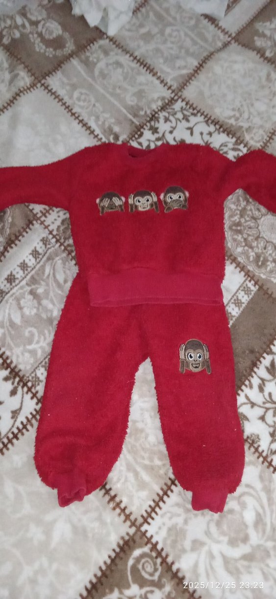 Kız çocukları için kırmızı, nakışlı maymun desenli, örme sweatshirt ve eşofman takımı. Bol kesim, uzun kollu ve yuvarlak yaka.