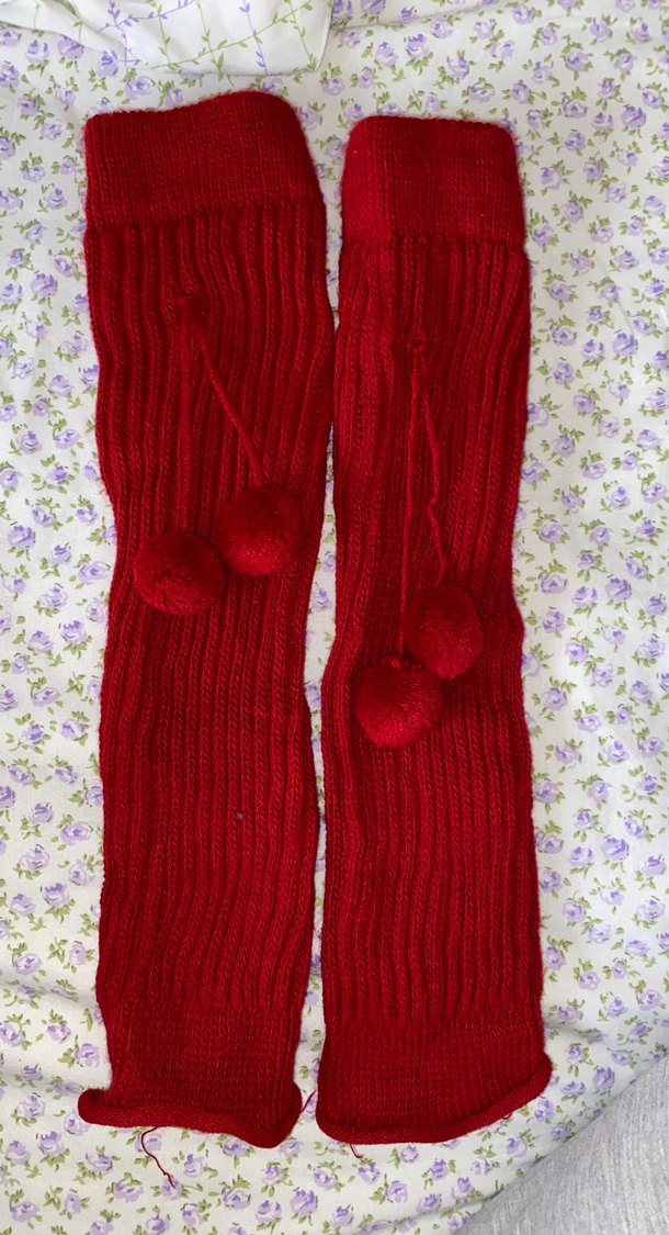 Kırmızı renkli, nakışlı ve ponpon detaylı kız çocuk triko çoraplar.