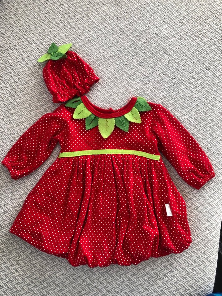 Kırmızı renkli, uzun kollu, yakası yuvarlak, nakışlı ve triko kumaştan yapılmış bohem tarzda kız çocuk elbisesi. Yeşil yaprak detaylı uyumlu şapkasıyla set.