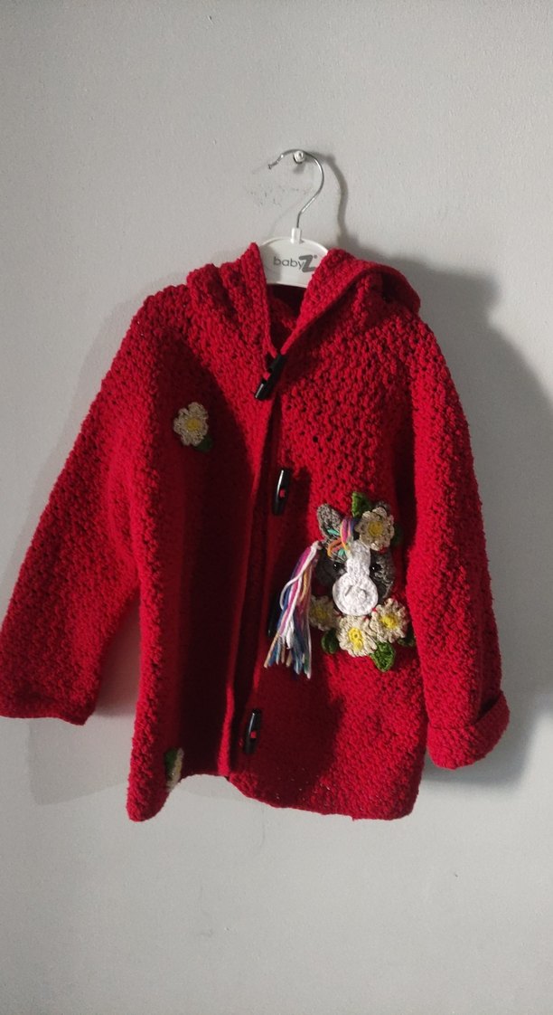 Bol kesim, uzun kollu kız çocuk hırkası. Örgü kumaştan, nakışlı renkli çiçek desenleri ve kapüşonlu. iki kol arası 40 cm omuzdan bele olan uzunluk 42 cm el örgüsü 3-4 yaş arası çocuklara çok rahat olur