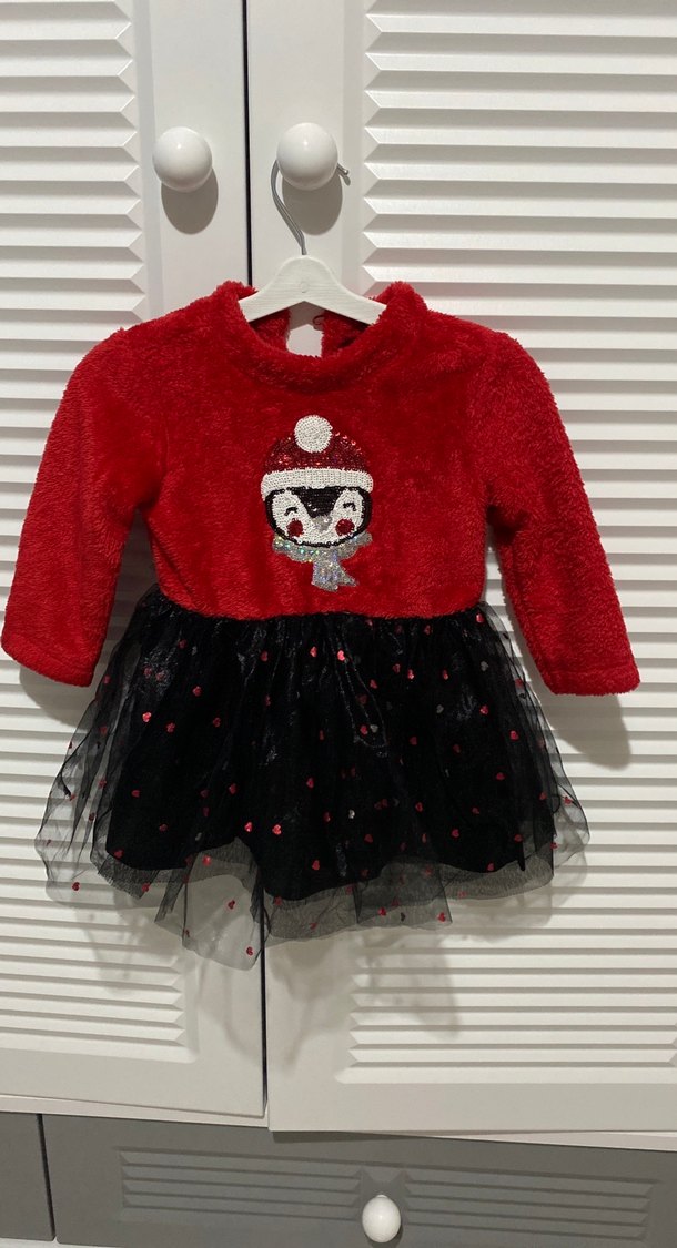 Kız çocuklar için uzun kollu, kruvaze yaka, yumuşak ve örgü dokulu kırmızı polar kumaştan yapılmıştır. Renkli nakışlı penguen figürü ve siyah tül etek üzerinde kırmızı noktalar bulunur. ❄️