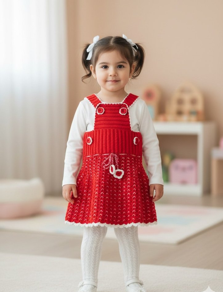 Kız çocuklar için bol kesim, askılı örgü elbise, renkli nakış detayları ve yumuşak dokulu örgü kumaşa sahiptir. Canlı kırmızı rengiyle sade bir tarz sunar.