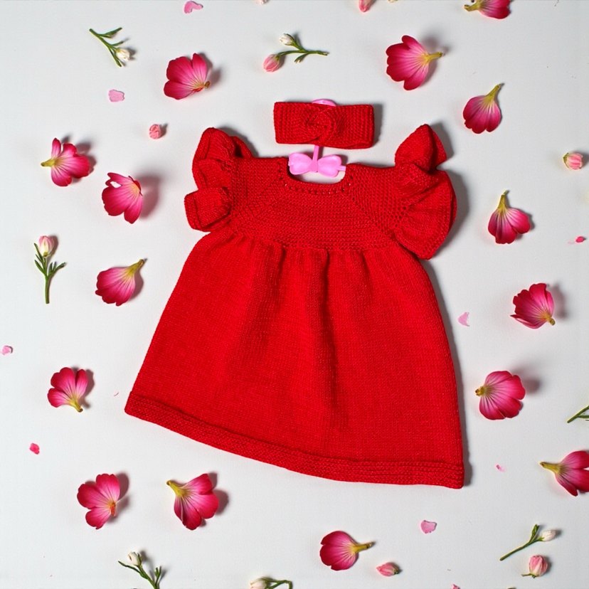 Kırmızı renkli, örgü kumaştan yapılmış, bohem tarzda, kayık yaka ve askılı kollara sahip kız çocuk elbisesi. Aynı kumaştan saç bandı ile birlikte.