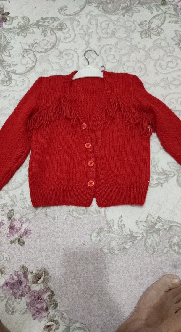Kırmızı renkli, uzun kollu, bol kesim, bohem tarzında püsküllü kız çocuk örgü hırka. Desensiz ve renkli tasarıma sahiptir.