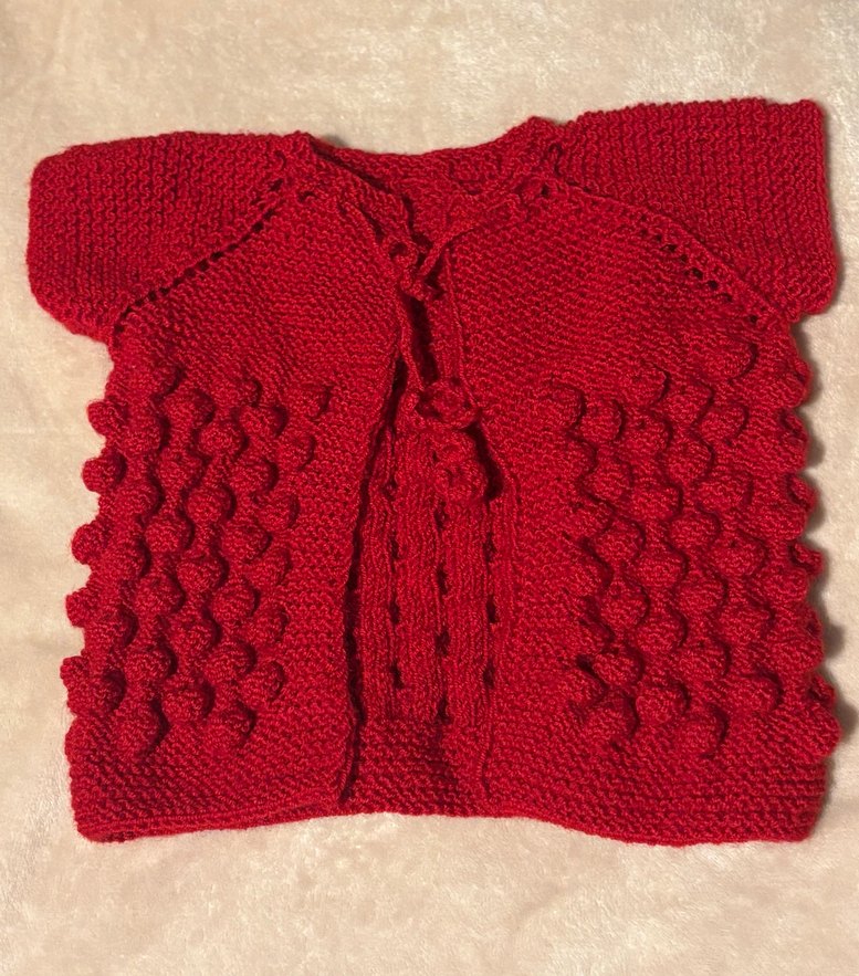 Kız çocukları için uzun kollu, kırmızı, fitted kesim örgü hırka. Bohem tarzda dokulu örgü detayları içerir. en 27 Boy 27 cm