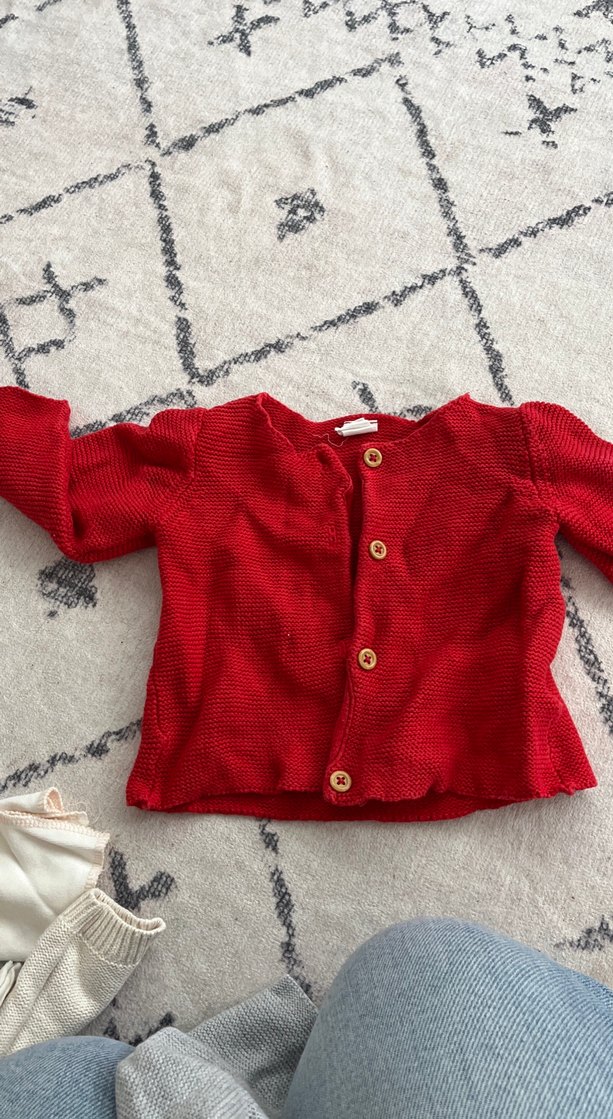Kız çocuk için kırmızı, uzun kollu, örgü ve bol kesim hırka. Düğmeleri ahşap görünümlüdür, desensiz sade bir tasarıma sahiptir.