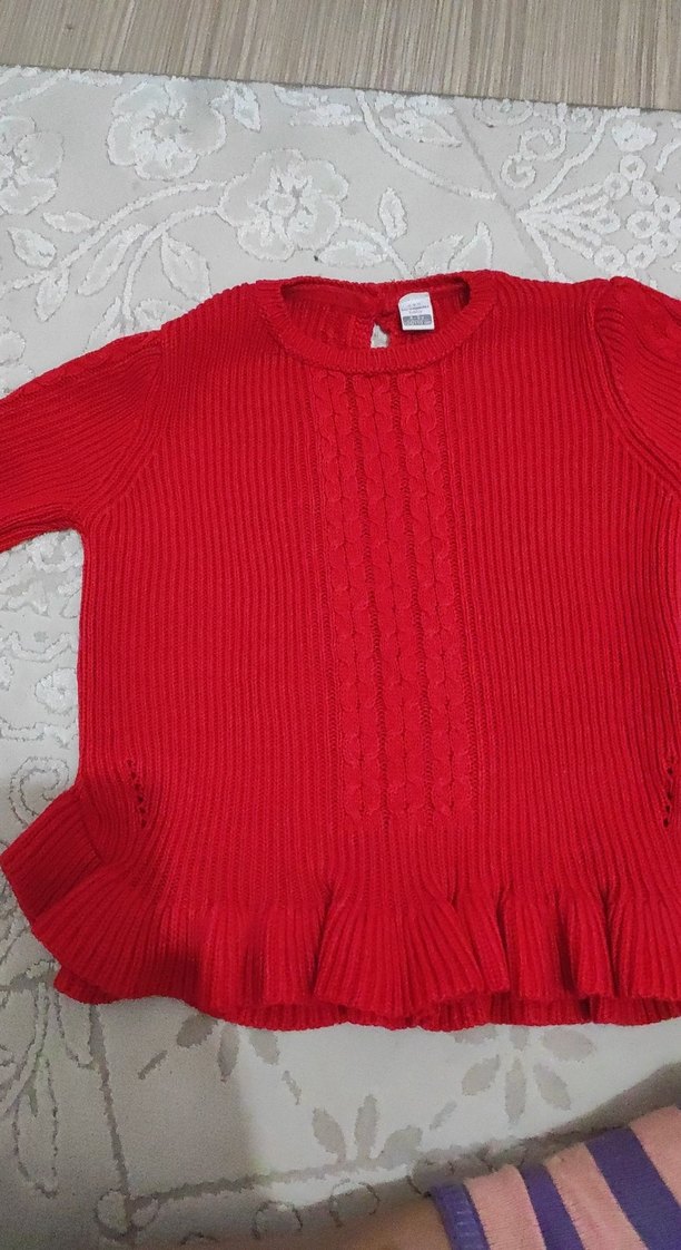 Kırmızı örgü kumaştan, uzun kollu, yuvarlak yakalı ve oturan kesime sahip kız çocuk kazak, fırfırlı etek ucu detaylıdır.