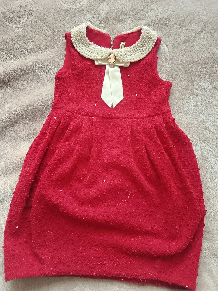 Klasik zarafet taşıyan, kırmızı renkli, kolsuz örgü kumaştan yapılmış, yakalı ve vücuda oturan modern klasik kız çocuk elbisesi. temiz ürün özel gün elbisesi