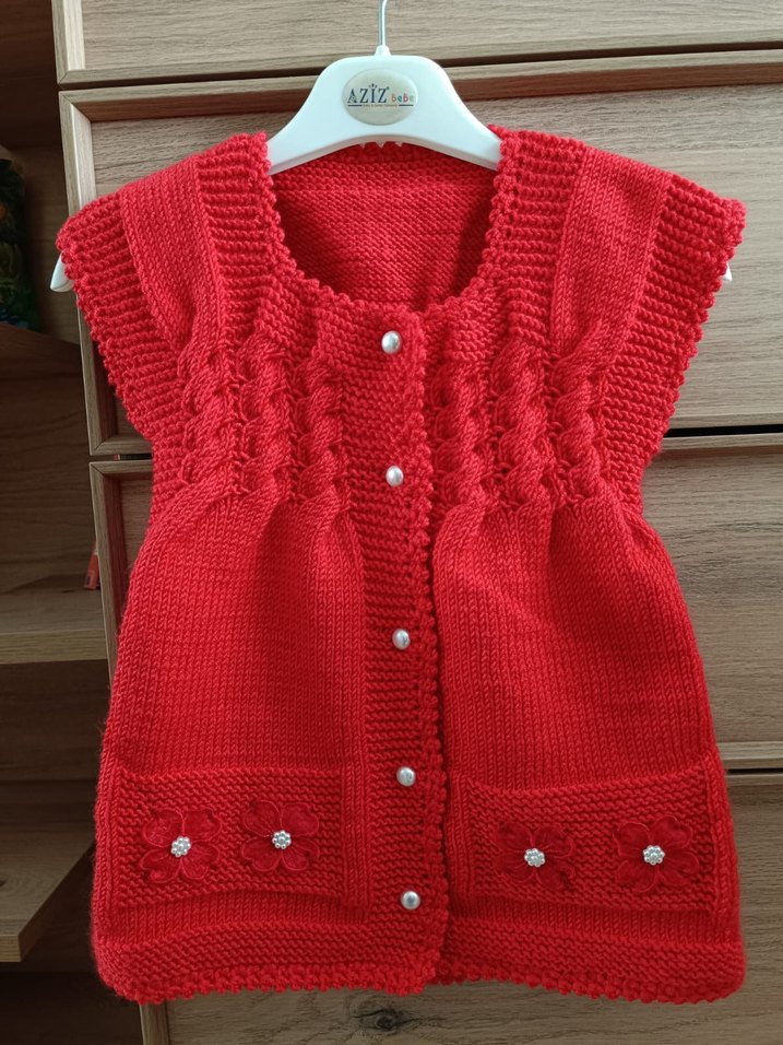 Kız çocukları için kolsuz, örgü, bohem tarzda fitted kırmızı hırka. İnci düğmeler ve ceplerde küçük çiçek detayları bulunur. 18-36 ay kullanıma uygundur.