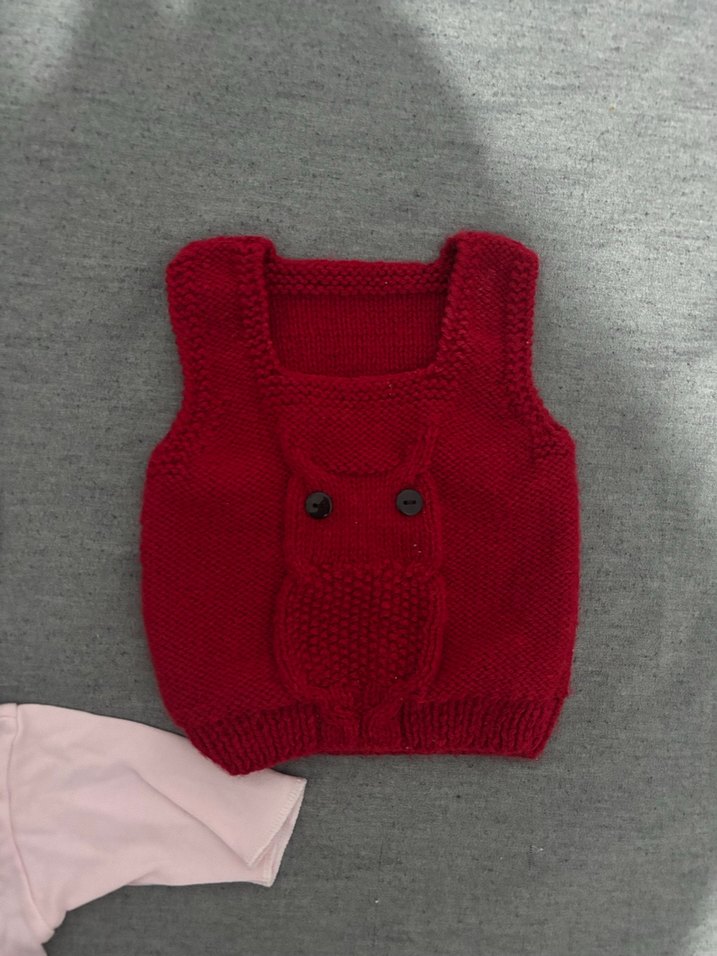 Fitted kesim, kolsuz ve yuvarlak yakalı kız çocuk yeleği. Örgü modeldir yenidoğanlar için daha iyi olur renki koyuya kaçan bir kırmızıdır bir kaç kez giyilmiştir.