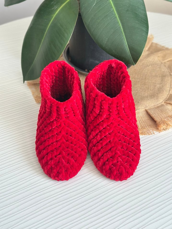 Kız çocuklar için kırmızı renkli, örgü yapıda, sıcak tutan ve sade tasarımlı ev terliği.