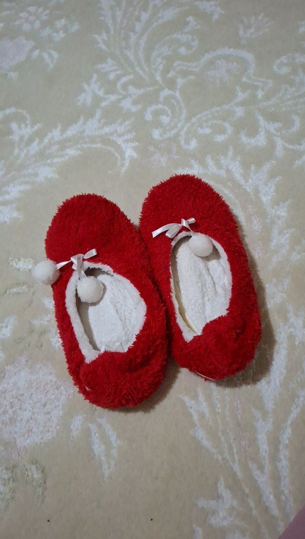 Kız çocukları için canlı kırmızı renkte, örgü tasarımlı, yumuşak ve sıcak tüylü iç yapıya sahip terlikler. Küçük fiyonk ve ponpon detayları bulunur.